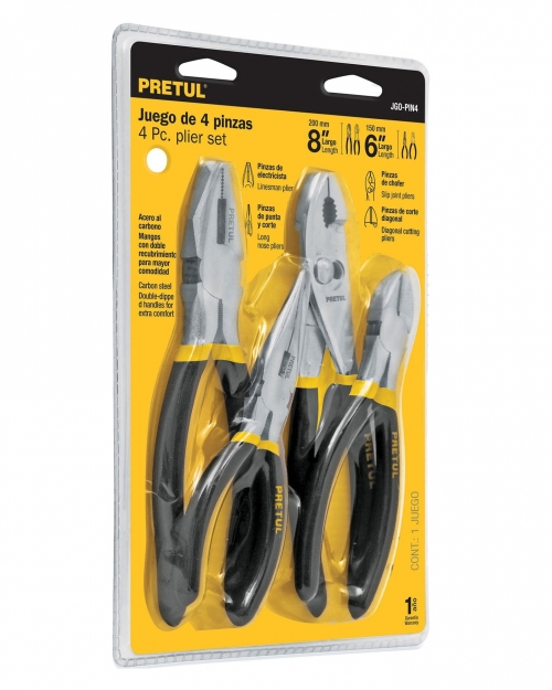 Fabricadas en acero al carbono con acabado pulido. Mangos de vinil de alto desempeño, en color negro con amarillo. Mordazas estriadas para sujetar con firmeza. Quijadas (mordazas) maquinadas con precisión para mejor sujeción. Pinza de punta y corte, para sujetar y doblar objetos pequeños.